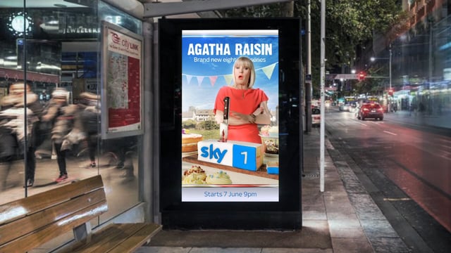 Coming back for a second series Agatha Raisin had began to realise her new life in the country wasn't quite the idilic haven of peace she had hoped for. The creative was designed to put a sinister twist on a traditional country fete where Agatha (Ashley Jensen) and her friend Roy (Matt Horne) find more than cupcakes on the cake stall.